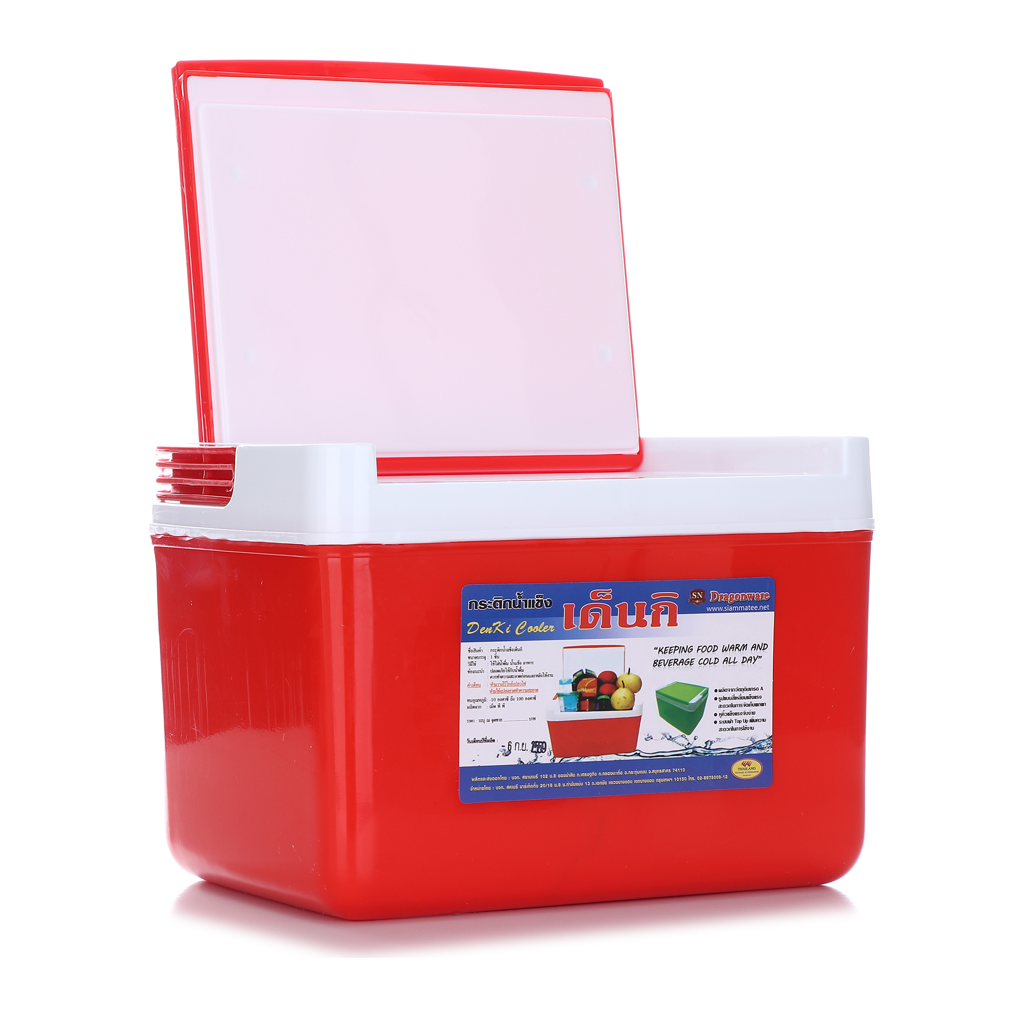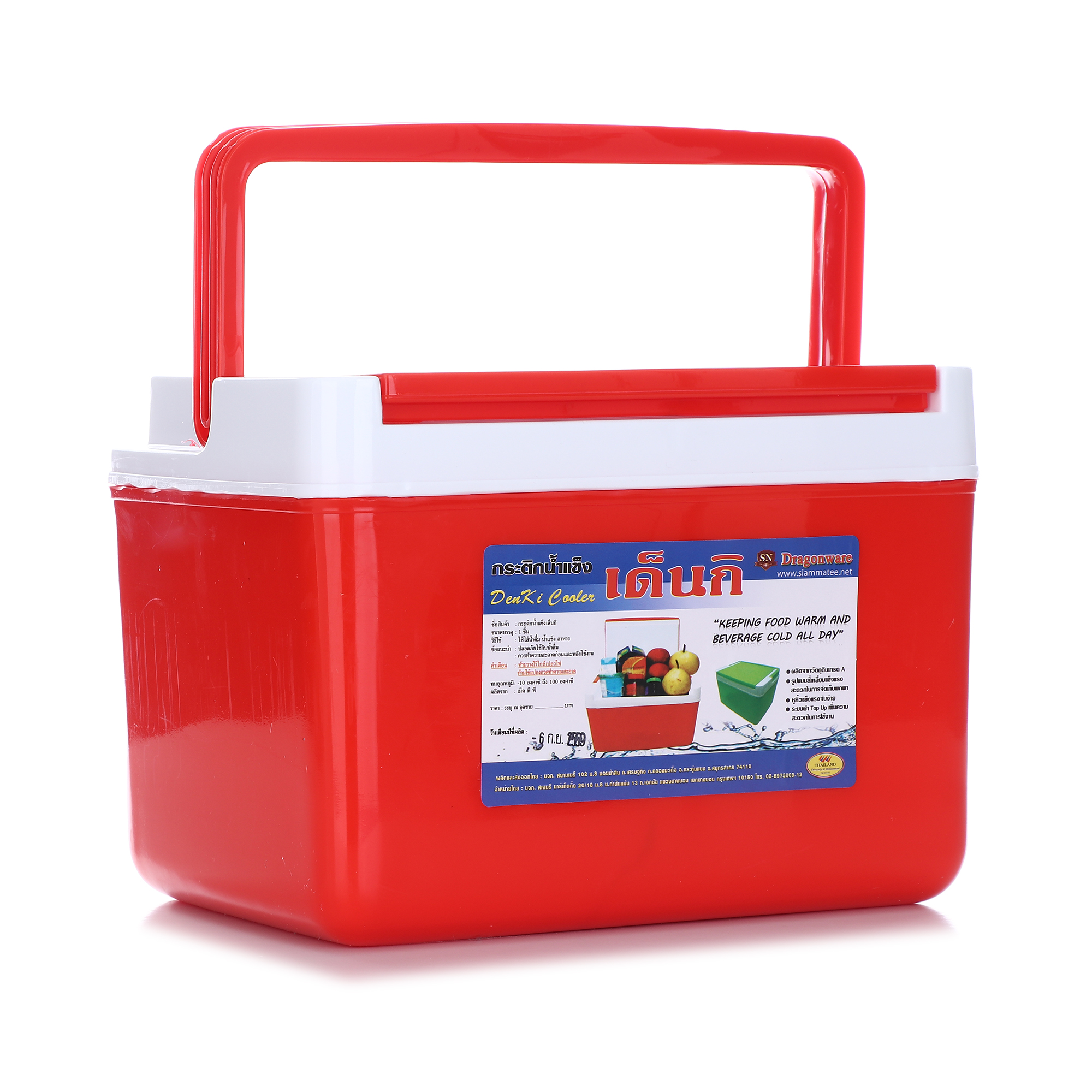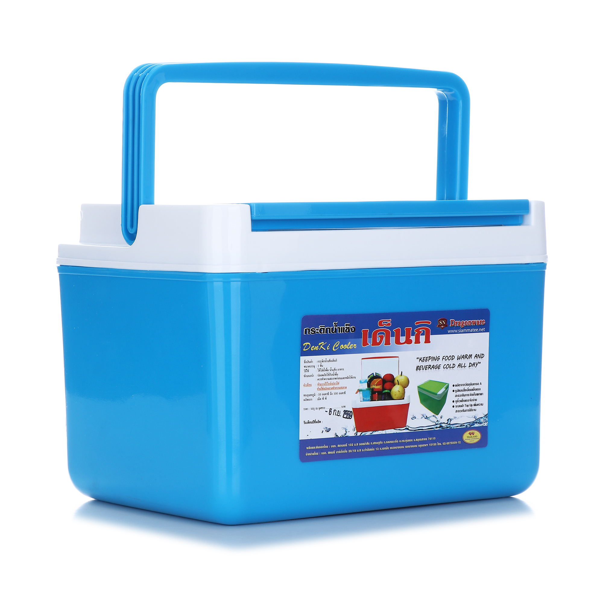 กระติกน้ำแข็งสี่เหลี่ยมพร้อมหิ้ว ผลิตจากพลาสติกและอัดโฟม เพื่อให้สามารถเก็บอุณหภูมิไว้ได้นานกว่า 8 ชั่วโมง สะดวกในการเคลื่อนย้ายและพกพาเดินทางไปนอกสถานที่ได้อย่างดี