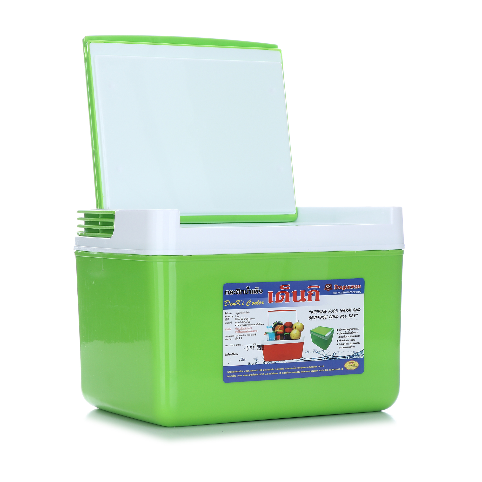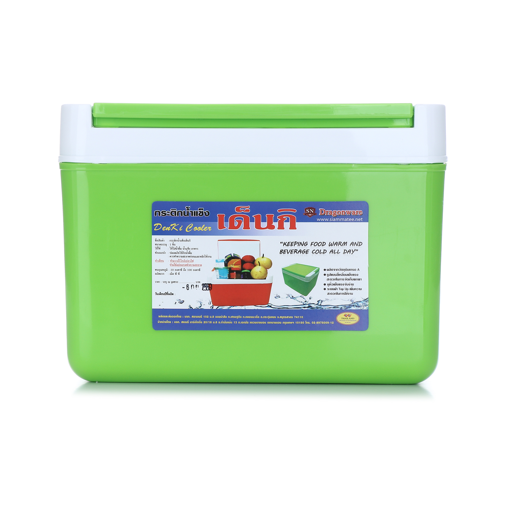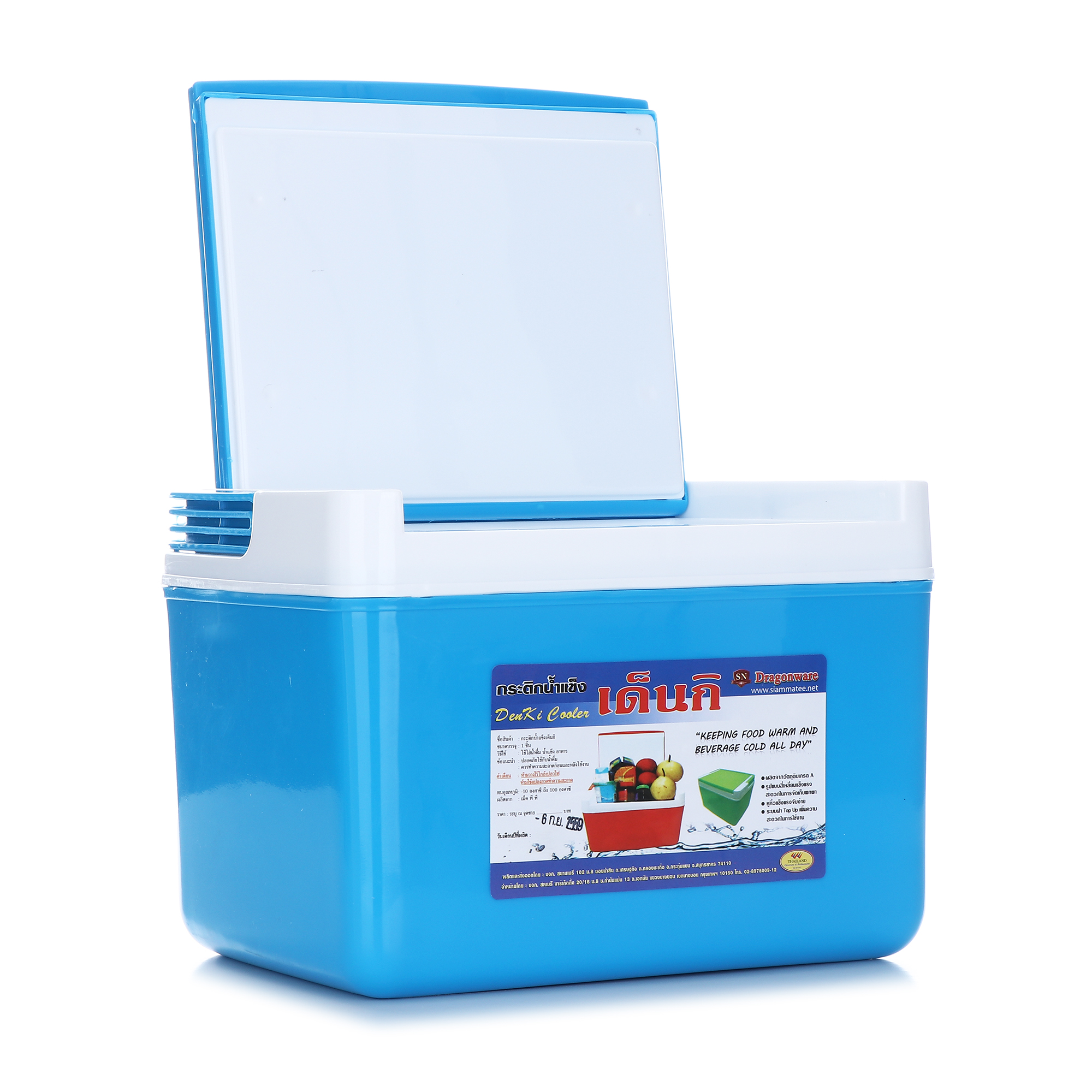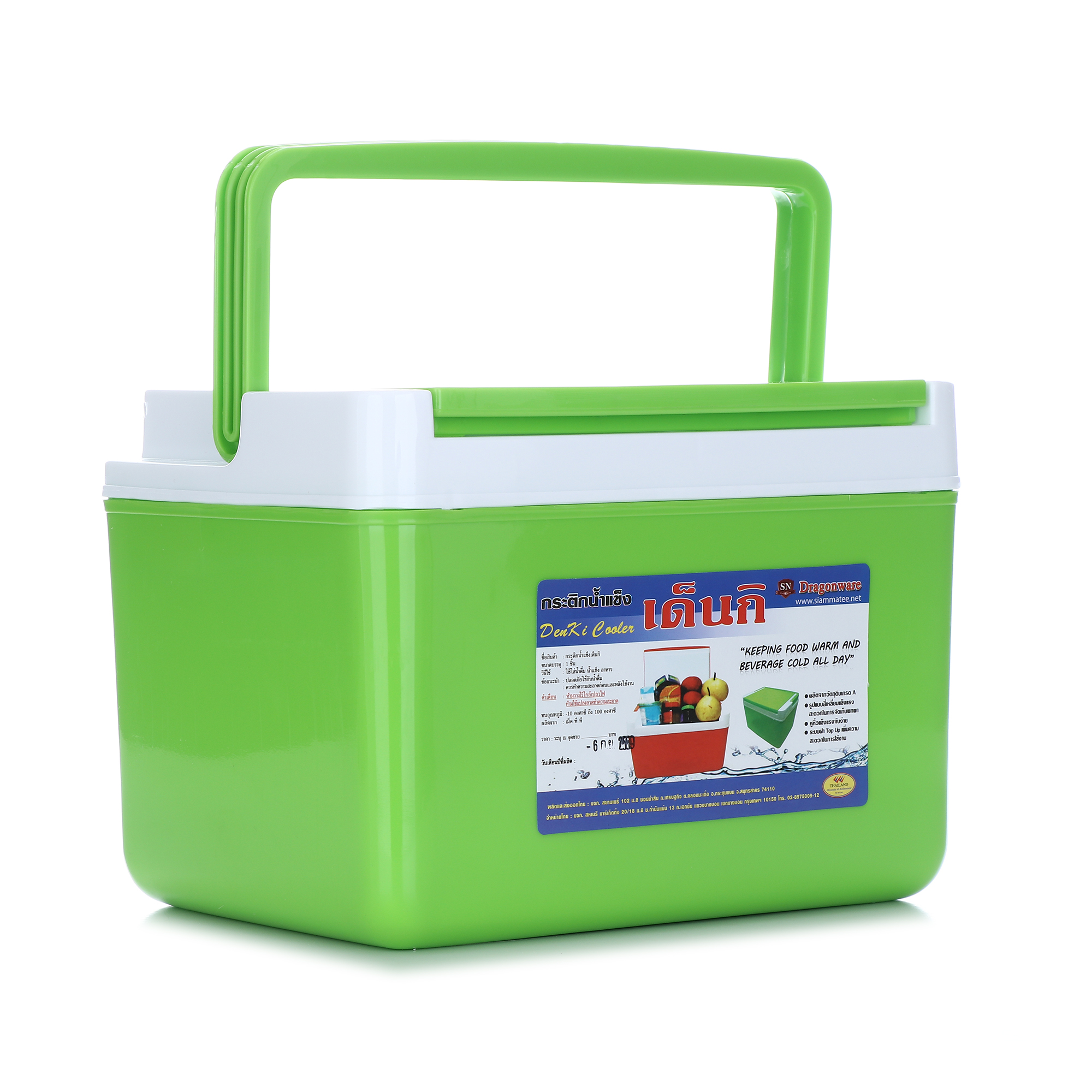 กระติกน้ำแข็งสี่เหลี่ยมพร้อมหิ้ว ผลิตจากพลาสติกและอัดโฟม เพื่อให้สามารถเก็บอุณหภูมิไว้ได้นานกว่า 8 ชั่วโมง สะดวกในการเคลื่อนย้ายและพกพาเดินทางไปนอกสถานที่ได้อย่างดี