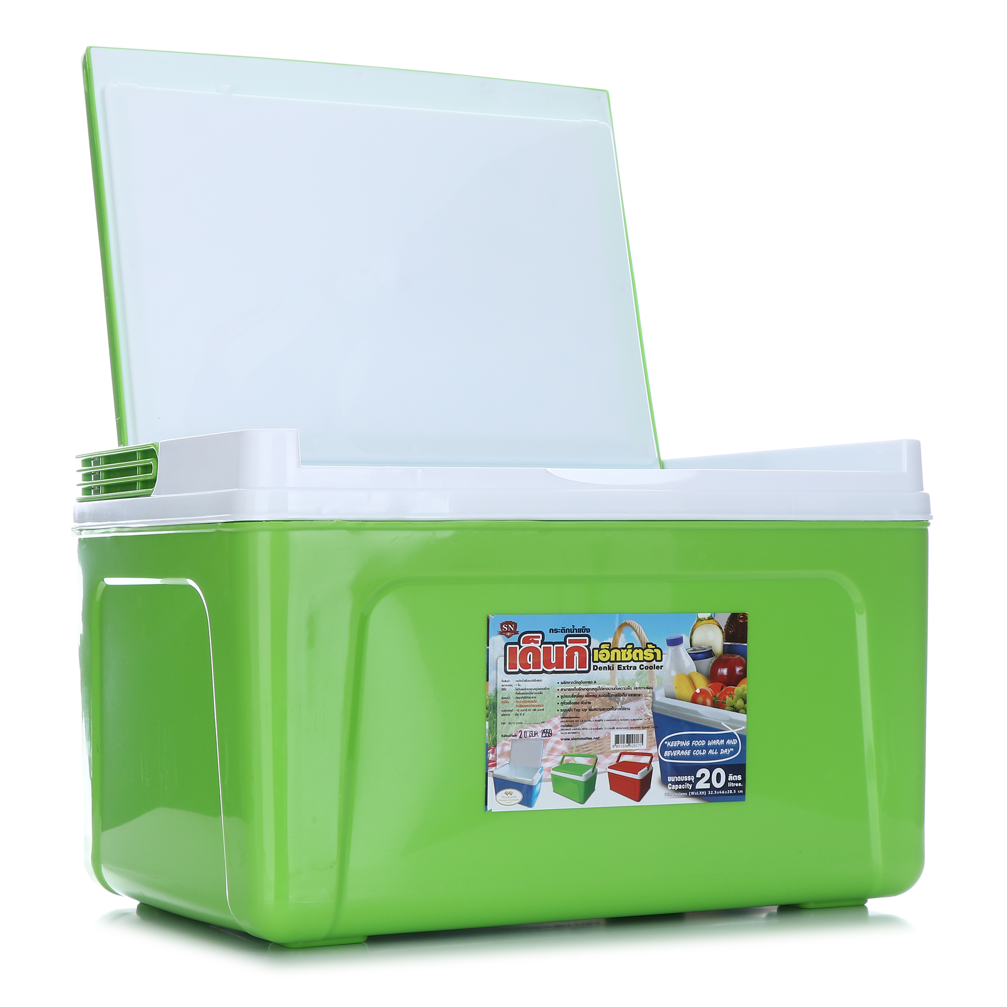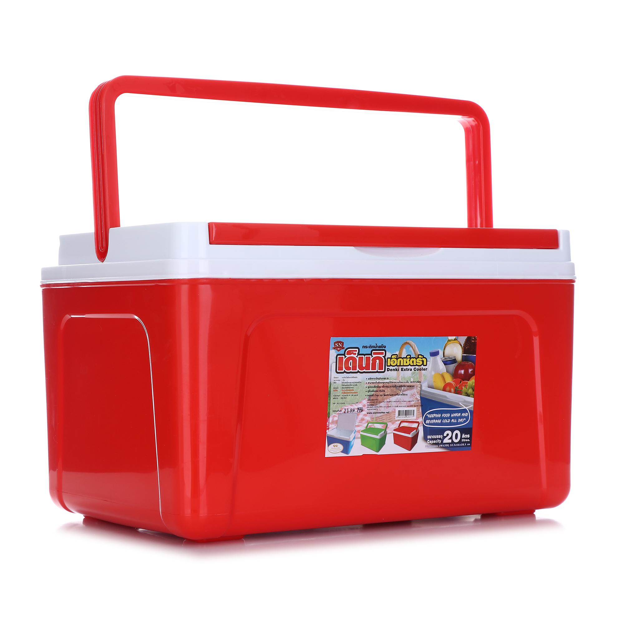 กระติกน้ำแข็งสี่เหลี่ยมพร้อมหิ้ว ผลิตจากพลาสติกและอัดโฟม เพื่อให้สามารถเก็บอุณหภูมิไว้ได้นานกว่า 8 ชั่วโมง สะดวกในการเคลื่อนย้ายและพกพาเดินทางไปนอกสถานที่ได้อย่างดี