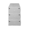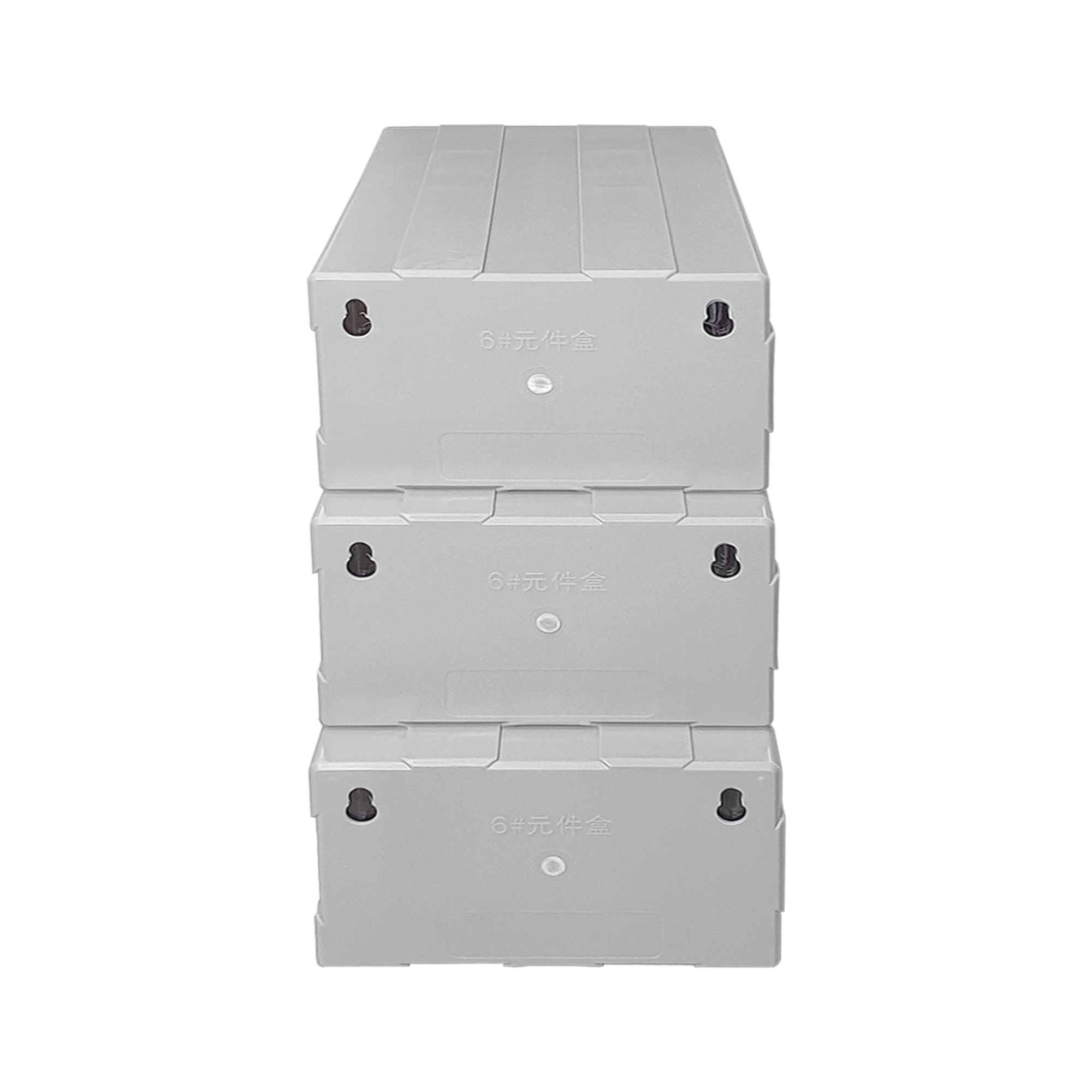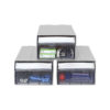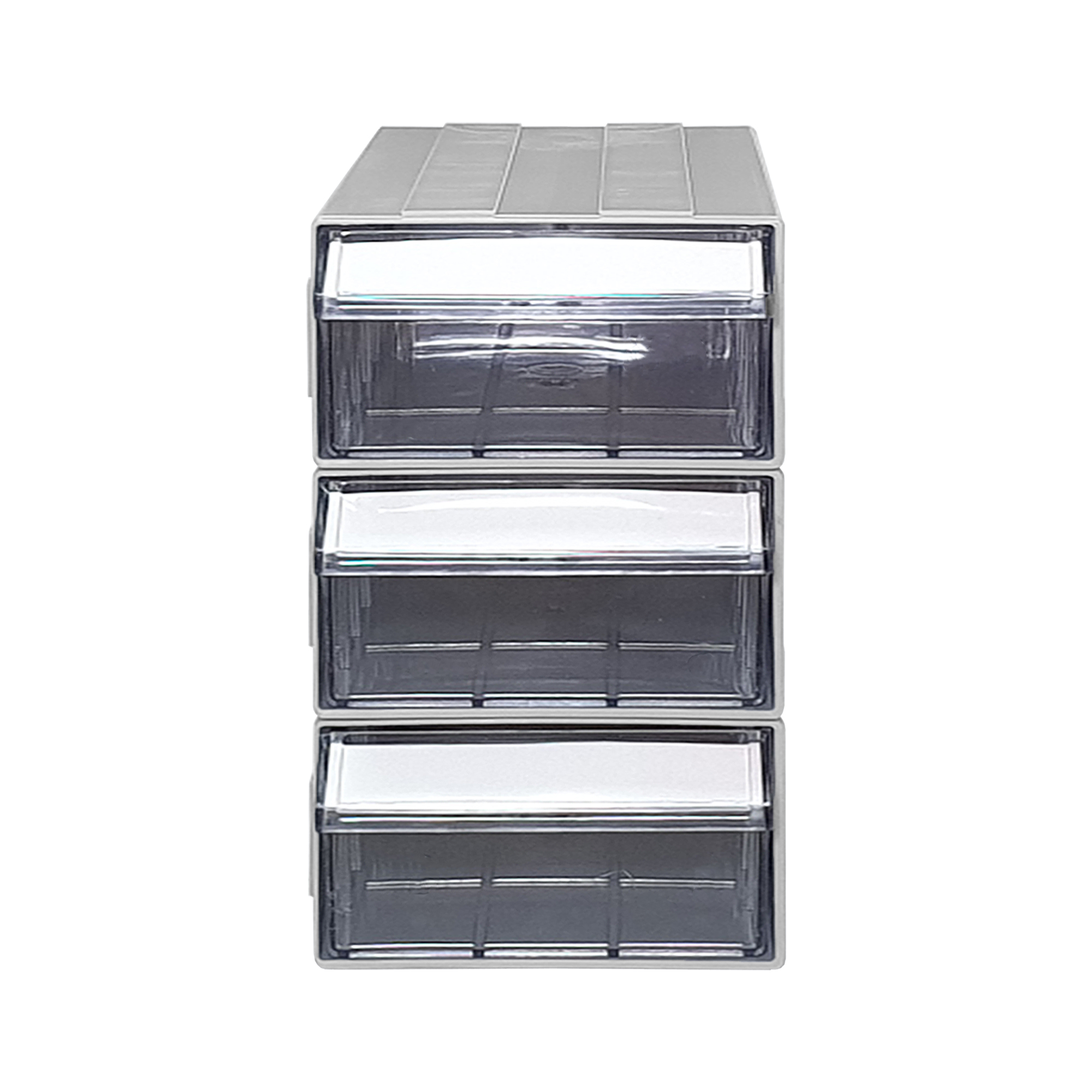 A medium-sized drawer box puts on a desk. F6 Plastic is strong and durable. Designed to hold small items such as electronic devices, nuts, small screws. or stationery in the office Drawers can be joined together to form a cabinet. With a hole on the back to attach to the wall if you want to hang.